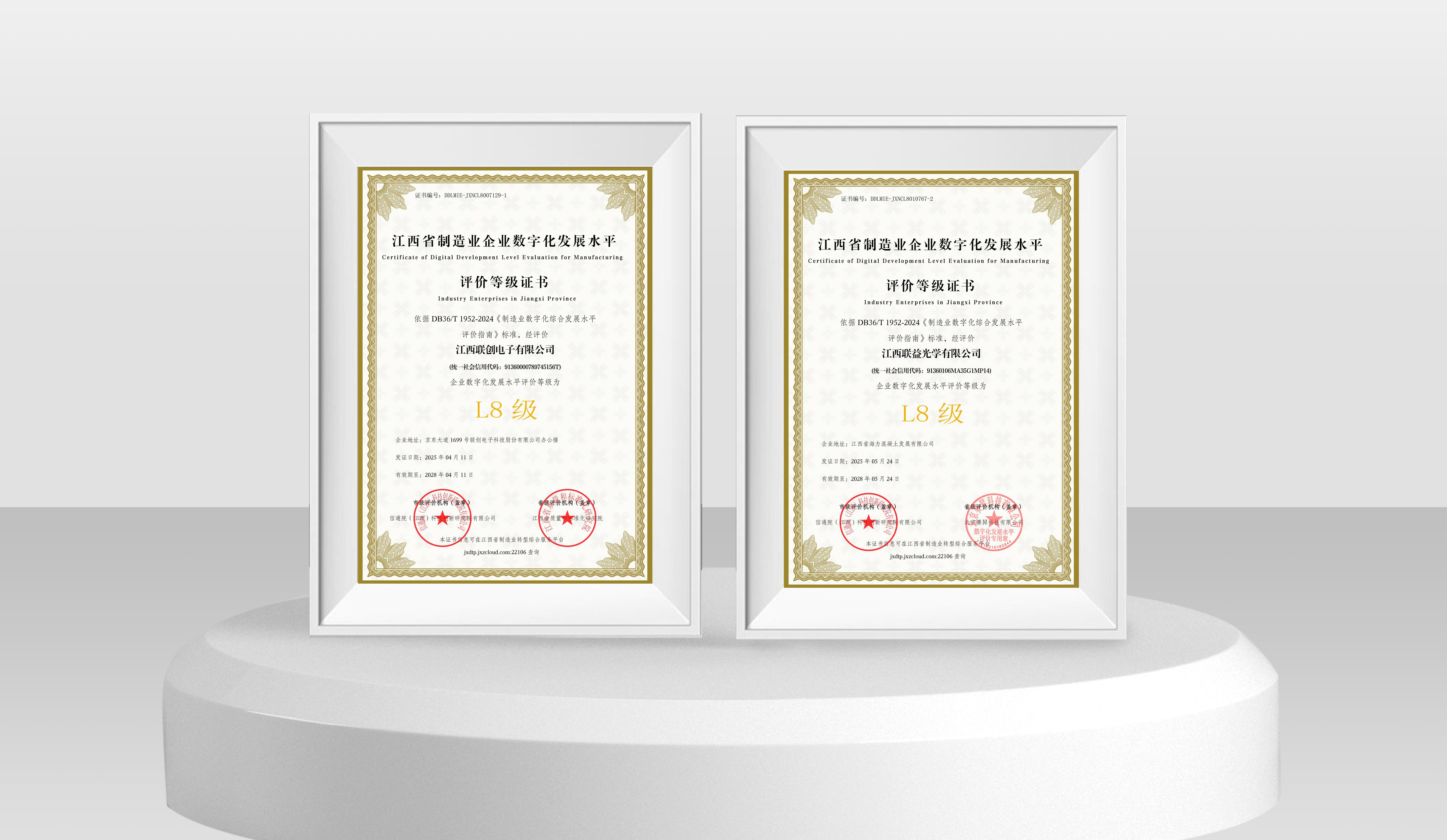 近日,联创电子科技股份有限公司旗下杏彩注册,杏彩体育平台网页版注册官网(以下简称江西联创)与江西联益光学有限公司(以下简称江西联益)凭借深度集成与创新应用能力,在江西省制造业企业数字化发展水平等级评价中双双达到L8级水平,标志着两家企业在数字化转型领域已跻身全省“集成提升阶段”最高水平,为全省制造业智能化升级树立新标杆。